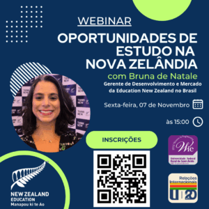 A Assessoria de Relações Internacionais promoverá nesta sexta-feira, dia 7 de novembro WEBINAR OFICIAL e GRATUITO sobre oportunidades de estudos na Nova Zelândia, Bruna de Natale, Gerente de Desenvolvimento e Mercado da Education New Zealand no Brasil.