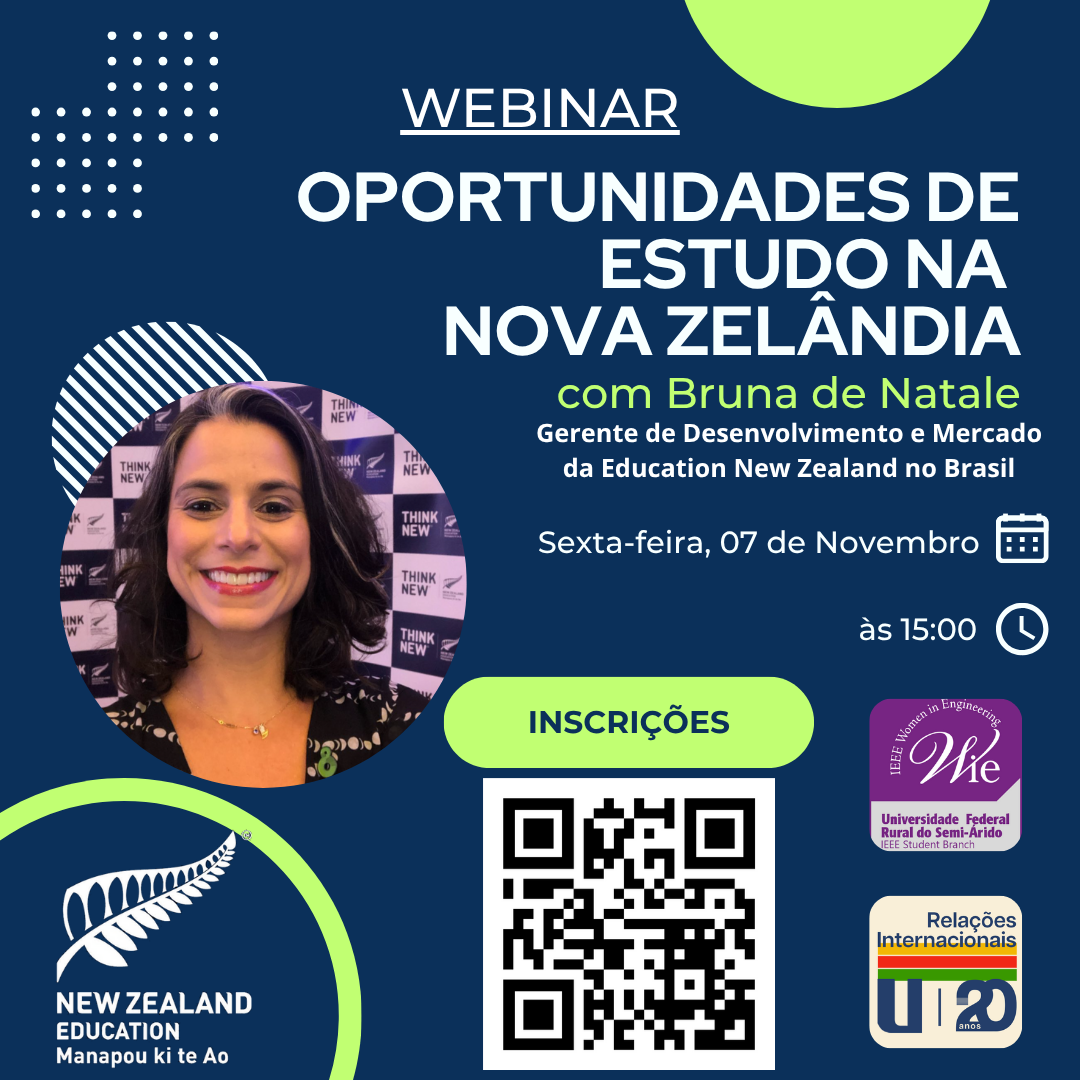 A Assessoria de Relações Internacionais promoverá nesta sexta-feira, dia 7 de novembro WEBINAR OFICIAL e GRATUITO sobre oportunidades de estudos na Nova Zelândia, Bruna de Natale, Gerente de Desenvolvimento e Mercado da Education New Zealand no Brasil.